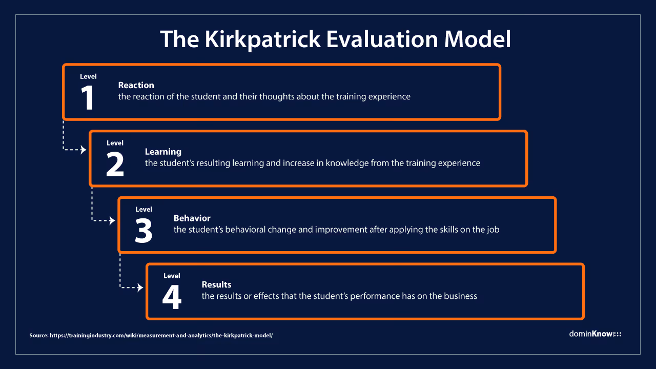 Level 1 of the Kirkpatrick Model focuses on learner reactions to your training. The measuring tool is a post-training survey or "smile sheet."